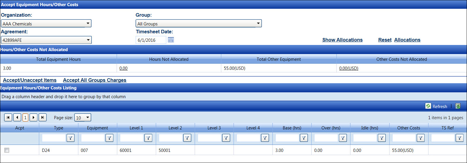 Clicking the Accept All Groups Charges link will accept all equipment hours and other costs in all equipment groups for the selected timesheet date. Follow the instructions below to accept equipment hours and other costs by line items. Always click the Show Allocations to refresh the screen.