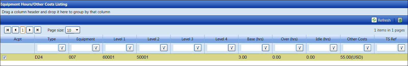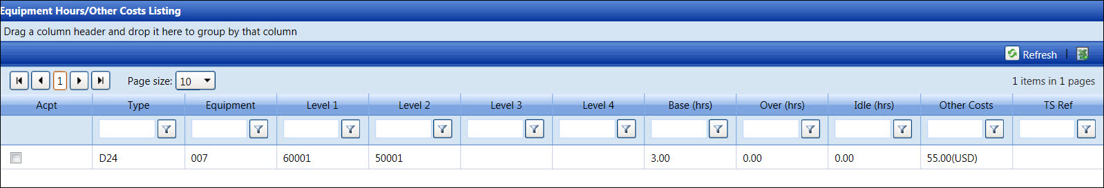 1. Clicking the Acceptance link from the Allocate Equipment Hours/Other Costs screen will open the Accept Equipment Hours/Other Costs screen.