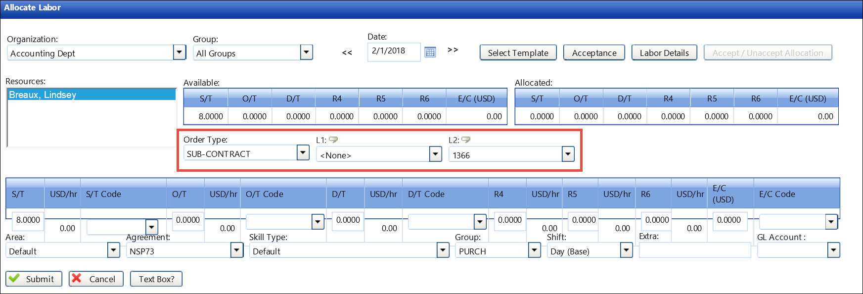 Clicking the Acceptance button will open the Accept Labor Hours/Costs screen. Refer to Accept Labor Hours and Costs for more information.