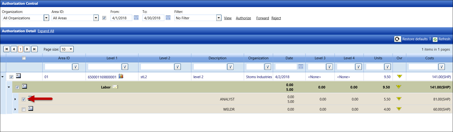 Click the View link to display the hours, other costs, or charges that are ready to be authorized. The records, displaying in the Authorization Detail grid, are grouped by a timesheet date and only display up to thirty days prior the selected From date.