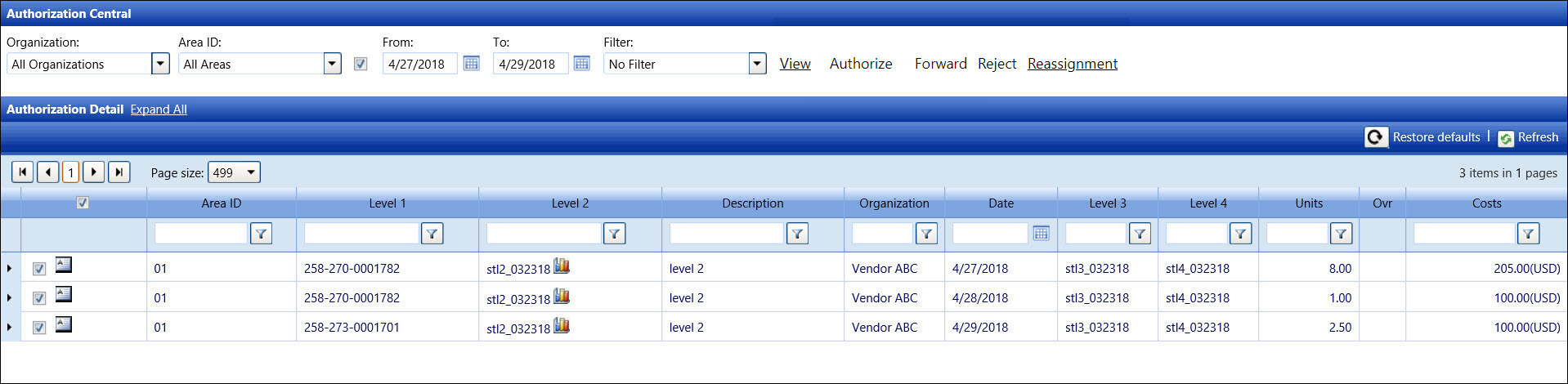 Click the View link to display the hours, other costs, or charges that are ready to be authorized. The records, displaying in the Authorization Detail grid, are grouped by a timesheet date and only display up to thirty days prior the selected From date.