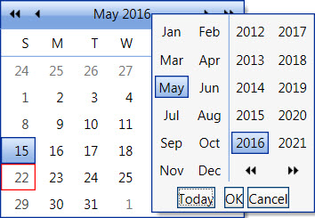 Select a month and/or a year to highlight them. Click the OK button. The pop-up menu closes and the selected month and/or year are displayed on the Calendar pop-up box.