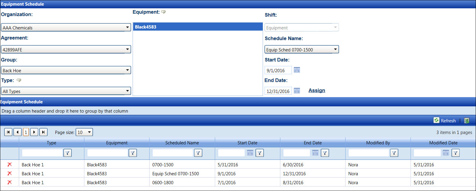 2. From the Equipment Schedule screen, select an organization from the Organization drop-down list to display its agreements in the Agreement drop-down list.