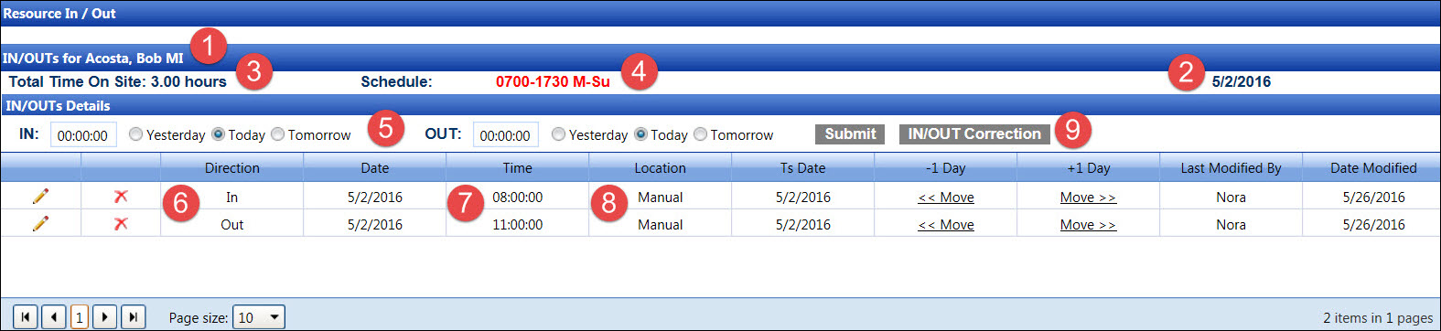 INs and OUTs time will be ordered by time. For each selected date, there should be a pair of the IN and OUT time. In the Resource IN/OUTs screenshot, the first row for 5/2/2016 displays the IN time 08:00:00. The next row of the same date displays the OUT time 11:00:00. If there is a missing IN or OUT time, then the time can be manually entered or with the IN/OUT Correction feature. Be sure to enter the time in a 24-hour format, Hours:Minutes:Seconds (HH:MM:SS).