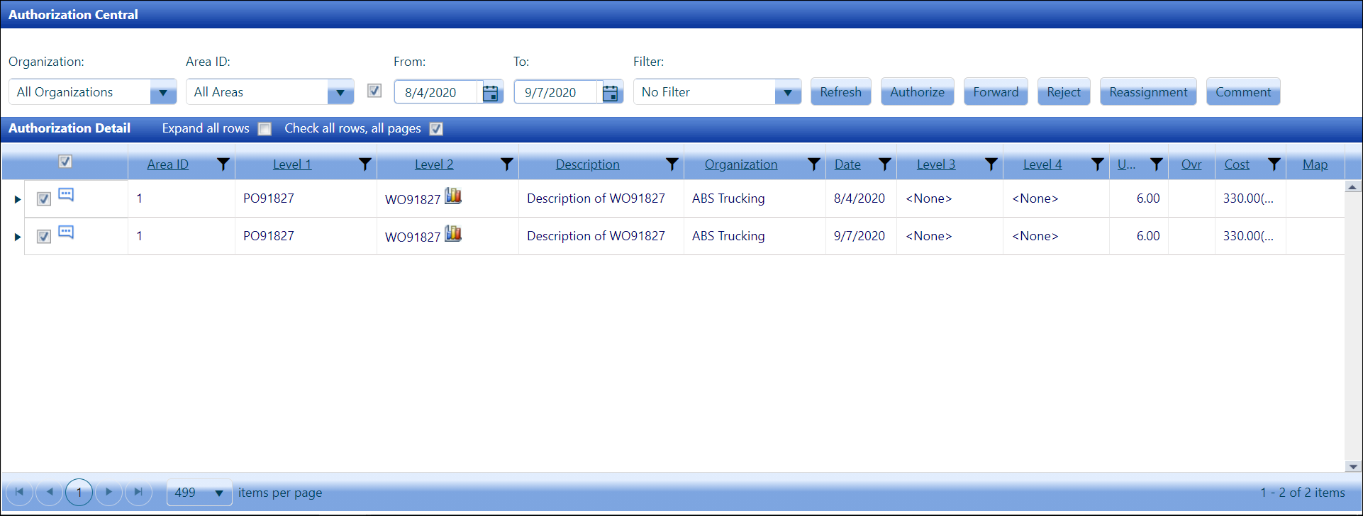 Once completed, click the Authorize button to process the authorization for the selected hours and costs.