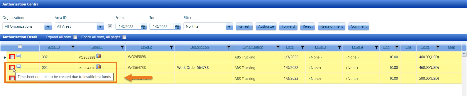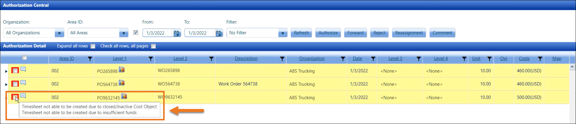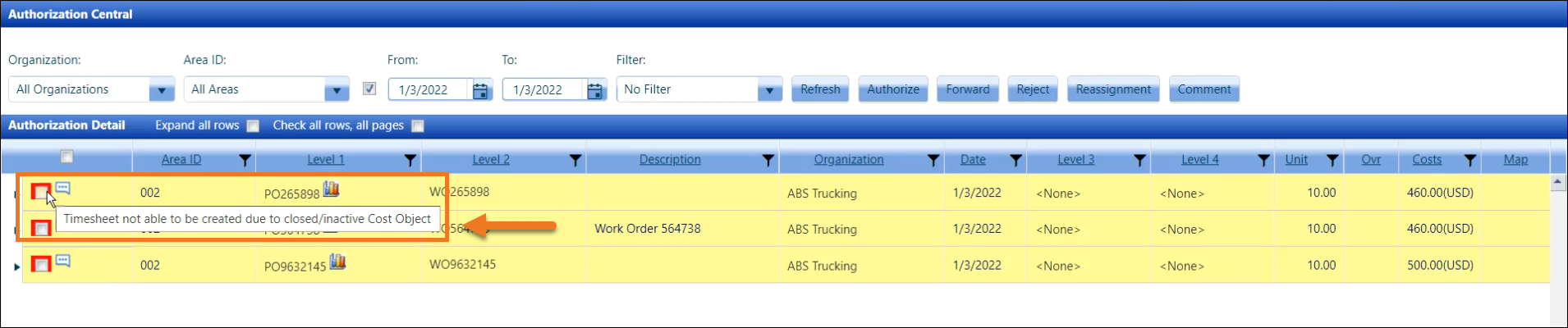 When the Enable authorization blocking for inactive Cost Objects option is enabled, and the cost objects have expired and/or are inactive, the red box will be displayed around the checkboxes at the Authorization Central screen for Authorization Central and Express Central. Hovering a mouse pointer over the checkbox at the Cost Object level will display the message, "Timesheet not able to be created due to closed/inactive Cost Object." These allocations pending authorizations line items will also display in yellow.