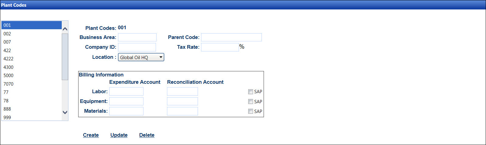From the Plant Codes screen, click on a plant code from the list box to highlight it and display its information in the text boxes, checkboxes, and a drop-down list.