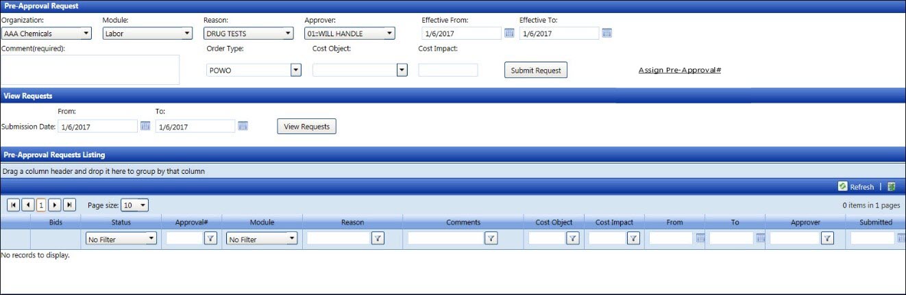 From the Pre-Approval Request screen, select an organization from the Organization drop-down list.