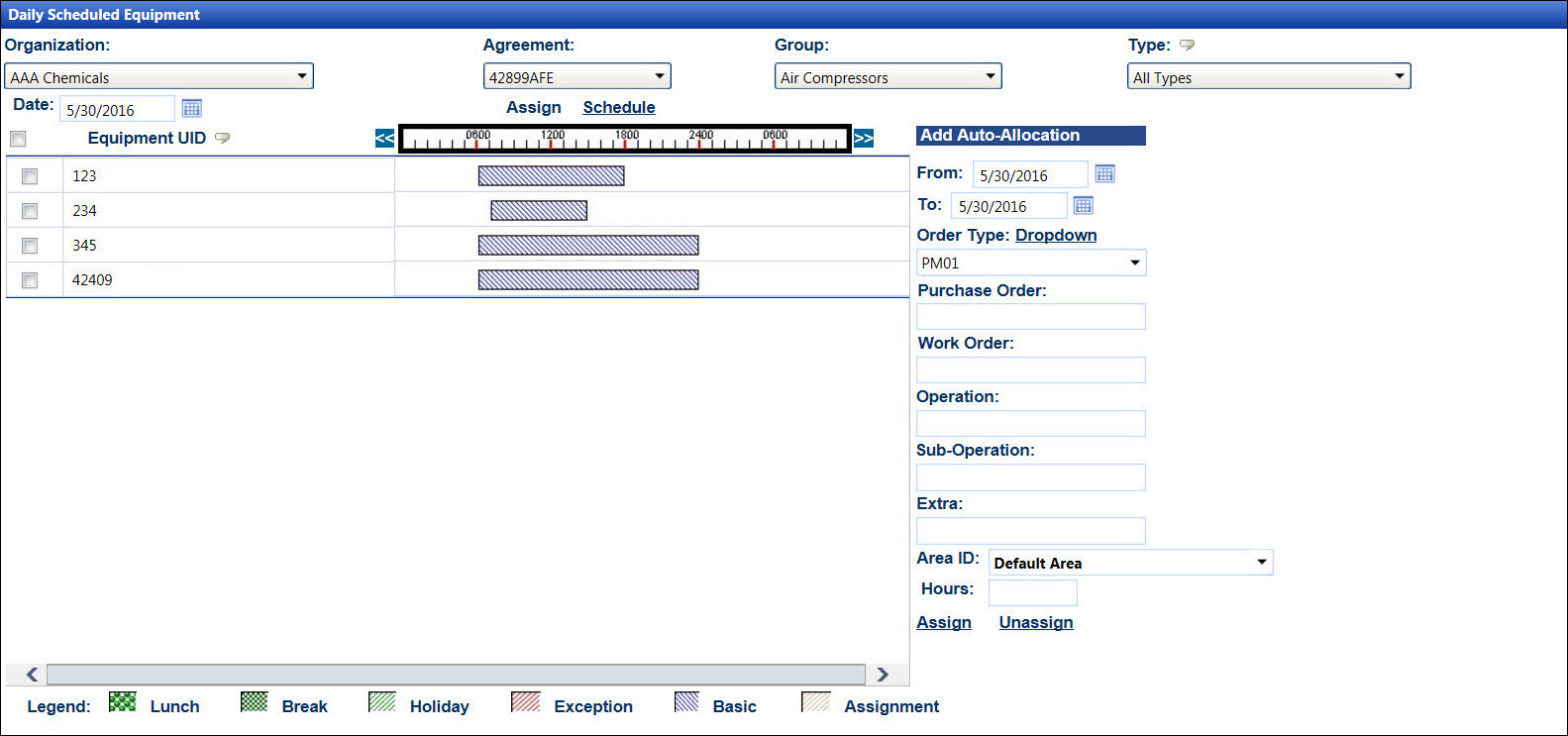 If an equipment has an auto-allocation, then its schedule graph has an assignment pattern. Hover a mouse pointer over the graph to display the tool-tip, detailing the schedule.